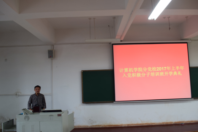 4月8日上午八点二十分,计算机学院分党校2017年上半年入党积极分子培训班开学典礼在南华大学雨母校区逸夫楼302教室顺利举行。计算机学院党委书记肖基毅,辅导员苏玲玲出席此次典礼。开学典礼由苏玲玲主持。