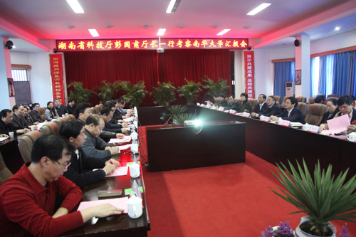 ??? 校党委书记邹树梁在汇报时指出,南华大学在50多年的办学历程中,积淀了鲜明的核、医、环保办学特色,凝练形成了铀资源开发、核技术及应用、核能工程技术、辐射防护与环境保护、核能经济与管理、动脉粥样硬化研究、支原体研究等特色的科研方向,为推动地方科技进步和产业发展,为服务核工业、医疗卫生事业作出了积极的贡献。