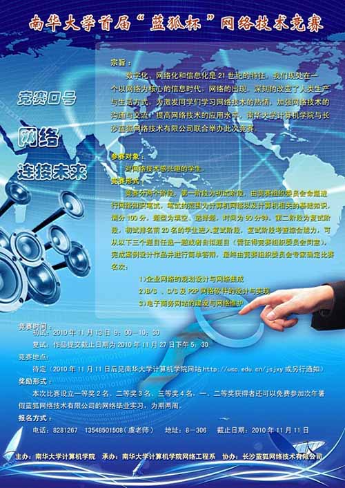 ??? 1.?宗旨:数字化、网络化和信息化是21世纪的特征,我们现处在一个以网络为核心的信息时代。网络的出现,深刻的改变了人类生产与生活方式。为激发同学们学习网络技术的热情,加强网络技术的沟通与交流,提高网络技术的应用水平,南华大学计算机学院与长沙蓝狐网络技术有限公司联合举办此次竞赛。